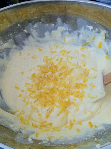 On ajoute alternativement, oeuf, sucre, puis extrait de vanille, fécule de pomme de terre… à la maryse on mélange en ajoutant la crème fraiche et on intègre le zeste de citron…. mmmm ça sent bon !!! Alors attention, il ne faut pas passer le batteur 107 ans sinon ça devient trop liquide ! comme ils disent pas dans le livre j’y suis allée au feeling…et ça rend pas mal :