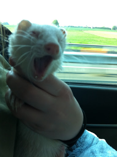 Boogie, la furette de ma petite sœur a par exemple une signification particulière. Cette petite furette est une furette que nous avons trouvé dans notre jardin en Juin 2006. Je venais à 30 ans de me faire larguer comme une grosse merde et je me retrouvais sur le carreau à devoir retourner vivre chez mes parents (c’est pour le contexte me concernant) – cette petite furette (nous ne connaissions pas du tout les furets) était dans un état pitoyable. Effrayée, toute pelée de partout, fort amaigrie, on avait même peur avec son allure de rat, ses petites dents pointues, ses yeux rouges… Et puis ma petite sœur Hélène l’a complètement adoptée, on l’a emmenée chez le vétérinaire, elle s’est refait une santé avec nous et je m’étais dis: ma petite Boogie, si toi tu survis, moi aussi je survivrai. Et c’est ce qu’on a fait. Elle était drôle ! Elle faisait des bonds, des petits bruits rigolos et elle nous fait des câlins. Depuis je ne vis plus à la maison mais je garde un contact à part avec Boogie. Et je crois qu’elle me sent, qu’elle me reconnaît car elle n’est jamais farouche avec moi. Elle blottit toujours son museau et me donne toujours des petites léchouilles sur la joue… Et non ce n’est PAS SALE!
