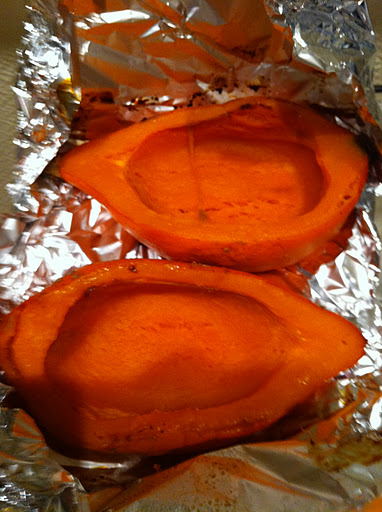Astuce cuisson du potimarron: coupé en deux, emballé dans de l’aluminium et et au four à 200° pendant une bonne heure (on surveille bien sûr)