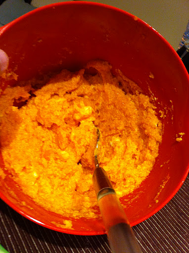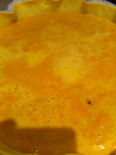 J’ai battu tous les ingrédients et hop, dans le fond de tarte ! Tout de suite, on sent comme le parfum de la cannelle, du gingembre, se marient divinement avec le potimarron… mmmmm !