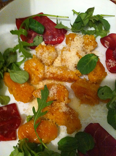 En parallèle, comme je suis un peu aventurière en cuisine, je me suis mis en tête de faire une recette que j’ai vu en zappant sur 100% Mag d’un ancien candidat de TOP CHEF, Brice, qui proposait des Gnocchi de Potimarron au Parmesan – c’est lui d’ailleurs qui a expliqué la technique de la papillote pour cuir les potimarrons.