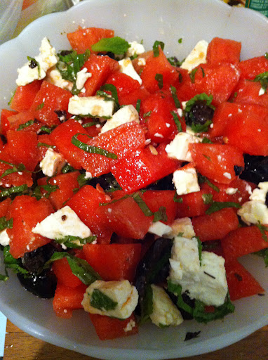 J’ai donc acheté une demi pastèque, de la menthe fraîche, une boite de feta et des olives noires à la grecque. Très important à la grecque pour le goût.