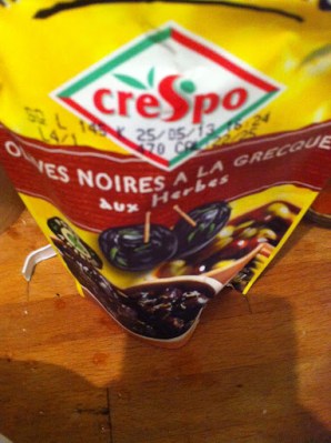 Ensuite on s’occupe des olives. Un petit sachet pour 2 (au moins 10 olives par personne) – avec un couteau de chef on dénoyaute en coupant en deux le long du noyau. Si ça fait des petits morceaux c’est pas grave.