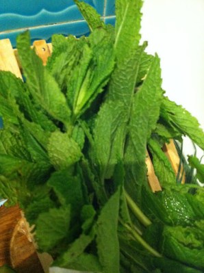 Et pour finir, les feuilles de menthe – une belle poignée – qu’on émince finement au couteau.