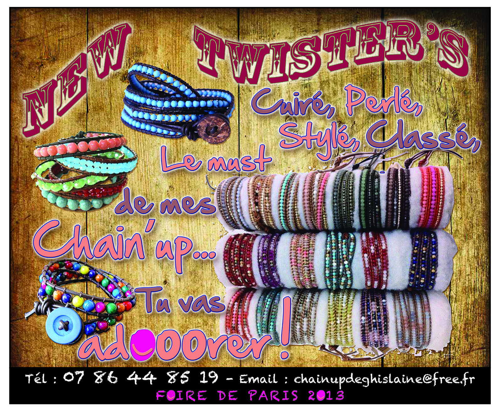 En exclusivité et pour la première fois à la Foire de Paris :Les New Twister’s des ChainUp’ de Ghislaine seront présents sur le Marché de la Foire, Stand 2.1 C10 – Des accessoires 100% naturels, 100% tendance et mode et 100% bonne cause !